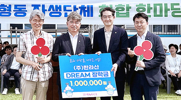[한라일보] 제주 향토기업 (주)한라산(대표이사 현재웅)은 지난 6일 제주고등학교 운동장에서 노형동 주민자치위원회(위원장 고성룡) 주관으로 열린 제8회 노형동 자생단체 화합 한마당에서 노형동 우수 장학생 2명에게 '드림장학금' 100만원을 전달했다.
