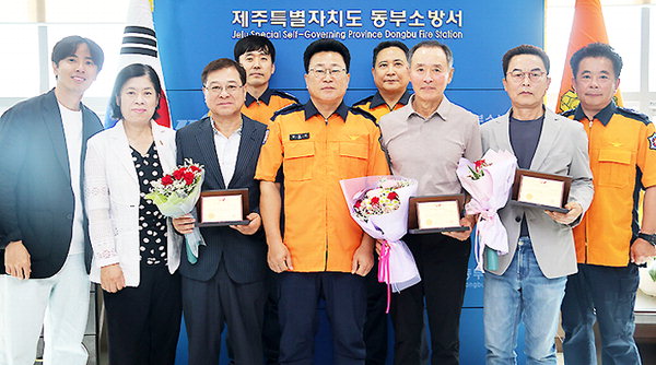 16일 동부소방서에 따르면 거문오름에 근무하고 있는 오영삼, 강경민, 고영호 씨는 지난 3월 2일 오름 트레킹을 하던 40대 여성 A씨가 심정지 증상을 보이며 쓰러진 것을 발견했다. 이들은 즉시 119에 신고했으며, 구급대가 도착하기 전까지 119상황실의 응급의료지도에 따라 심폐소생술 및 자동제세동기를 사용해 응급처치에 나섰다. 그 결과 A씨는 자발순환이 회복된 채로 무사히 119구급대에 인계됐다.