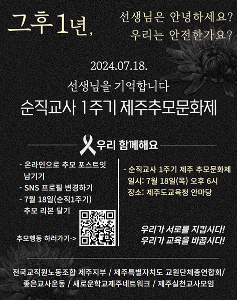 전국교직원노동조합제주지부, 제주특별자치도교원단체총연합회, 제주좋은교사운동, 새로운학교제주네트워크, 제주실천교육교사모임은 18일 제주도교육청 안마당에서 '순직교사 1주기 제주추모문화제'를 개최한다.