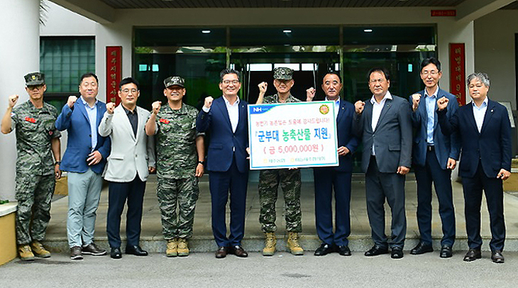 농협제주본부(본부장 윤재춘)와 마늘제주협의회(회장 강성방 대정농협 조합장)는 18일 해병대 제9여단(여단장 박승일)을 방문해 500만원 상당의 농축산물을 지원했다.