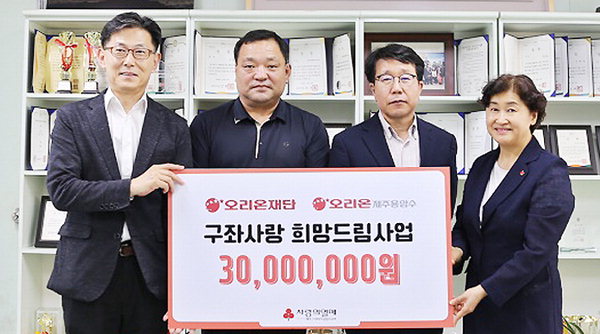 [한라일보] (주)오리온제주용암수(대표이사 현종훈)와 (재)오리온재단(이사장 이승준)은 최근 제주시 구좌읍사무소에서 '구좌사랑 희망드림사업'으로 제주사회복지공동모금회(회장 강지언)에 3000만원을 기탁했다.