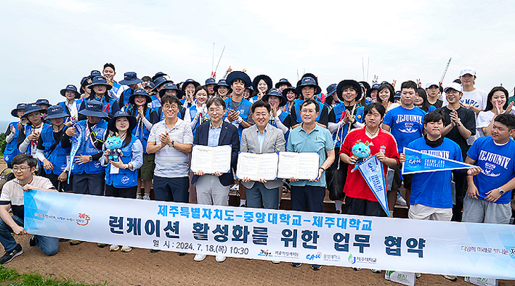 도는 18일 제주시 도두동 도두봉 정상에서 중앙대, 제주대와 상생발전을 위한 공동 협력을 도모하는 업무협약을 체결했다.