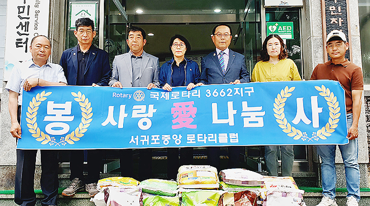 서귀포중앙로타리클럽(회장 이성훈)은 지난 18일 천지동주민센터(동장 강은아)를 방문해 지역 내 저소득 취약계층에게 전해 달라며 사랑의 쌀 310㎏을 기부했다.