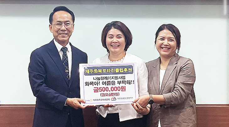 제주화목로타리클럽(회장 송복래)은 지난 17일 제주영락종합사회복지관(관장 이상언)에 취약계층 나눔릴레이지원사업을 위해 50만원을 후원했다.