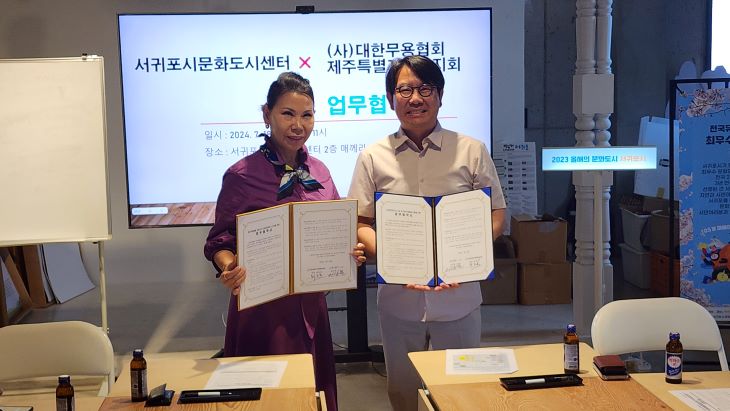 (사)대한무용협회 제주특별자치도지회(지회장 최길복, 왼쪽)와 서귀포시문화도시센터(센터장 이광준)는 지난 18일 서귀포시문화도시센터 2층에서 상호 업무협약을 체결했다.
