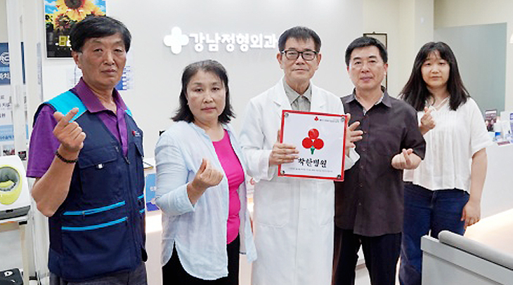 서귀포시 대정읍 소재 강남정형외과(원장 장승원)는 최근 대정읍지역사회보장협의체(공동위원장 한분도·이란)와 제주사회복지공동모금회(회장 강지언)가 함께하는 '착한가게 캠페인'에 동참하고 현판 전달식을 가졌다.