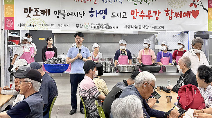 서귀포시 서호동 소재 서호교회(목사 조영진)는 지난 26일 서귀포종합사회복지관 경로식당을 방문해 어르신 250여 명을 대상으로 사랑과 나눔을 함께하는 급식 봉사를 펼쳤다.