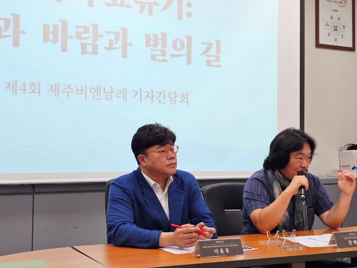 29일 제주도립미술관에서 열린 제4회 제주비엔날레 기자간담회에서 출입기자들의 질문에 답하고 있는 강제욱 전시감독(오른쪽).