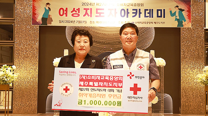 (사)소비자교육중앙회 제주특별자치도지부(회장 문화순)는 지난 27일 '2024 제27회 전도 소비자교육중앙회 여성 활동가 아카데미' 개최를 맞아 대한적십자사제주특별자치도지사(회장 정태근)에 사옥 이전 지원금 100만원을 기탁했다.