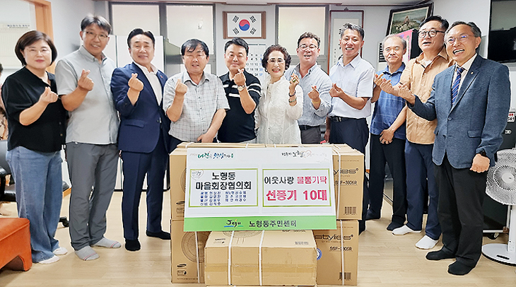 제주시 노형동마을회장협의회(회장 현상진)는 지난 25일 노형 으뜸마을 아파트 단지를 방문해 여름철 무더위를 식혀줄 선풍기 10대를 기탁했다.