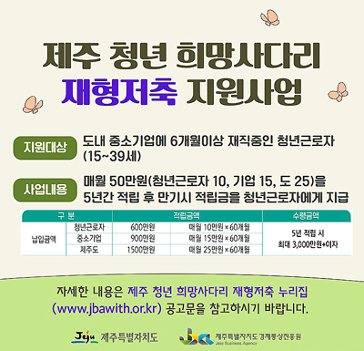 제주 청년 희망사다리 재형저축 사업은 도내 중소기업 청년근로자의 장기재직을 유도해 기업의 고용안정성 제고 및 기업 경쟁력 강화를 위해 제주특별자치도와 경제통상진흥원이 추진하고 있는 사업으로, 매월 50만원(청년근로자 10, 기업 15, 도 25)을 5년간 적립 후 만기 시 적립금(3000만원)을 청년근로자에게 지급하게 된다.