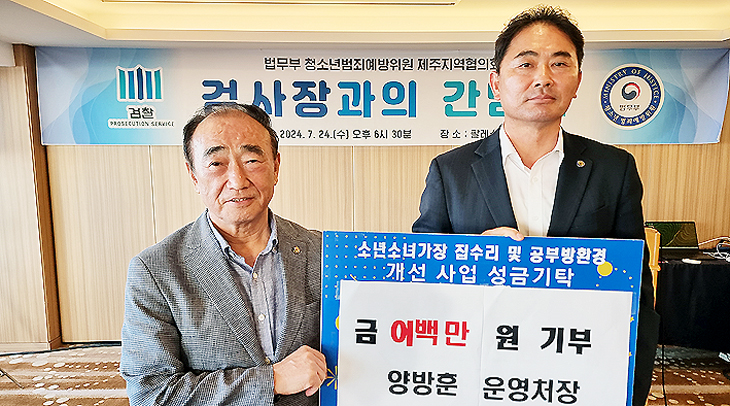 양방훈 법무부 청소년범죄예방위원 제주지역협의회(회장 고영두) 자원봉사분과위원회 운영처장((주)이노 네트웍스 대표이사)은 지난 24일 도내 청소년들의 공부방 환경 개선사업을 위해 성금 200만원을 기탁했다.