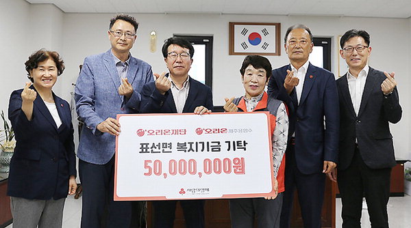 [한라일보] (주)오리온제주용암수(대표이사 현종훈)와 (재)오리온재단(이사장 이승준)은 최근 서귀포시 표선면사무소에서 제주사회복지공동모금회(회장 강지언)에 성금 5000만원을 기탁했다.