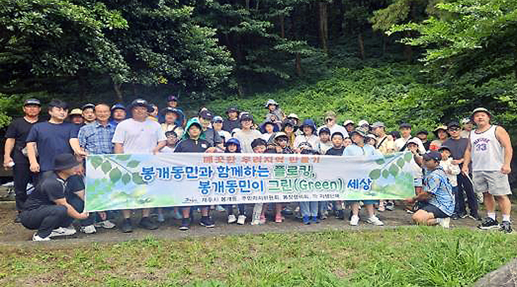 제주시 봉개동(동장 김문규)은 지난 4일 안세미오름 일원에서 연합청년회, 지역 초등학생과 학부모 등 150여 명이 참여해 가운데 오름 플로킹 행사를 실시했다.