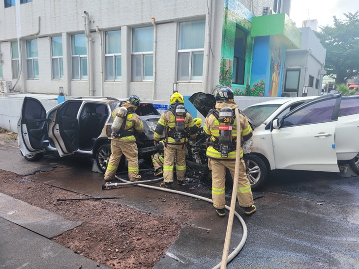 13일 제주시 연동의 한 도로에서 차량 화재가 발생했다. 도 소방안전본부 제공