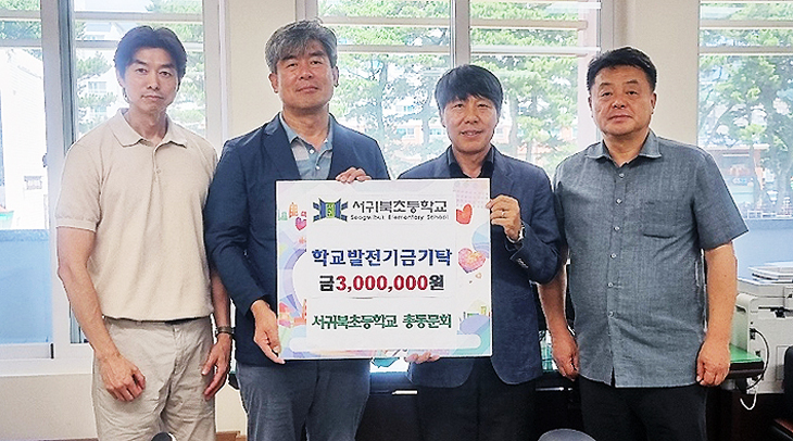 서귀북초등학교총동문회(회장 강성극)는 지난 12일 서귀북초등학교(교장 강경봉)를 방문해 교내 오케스트라 활동 지원금 등에 써 달라며 학교발전기금 300만원을 전달했다.