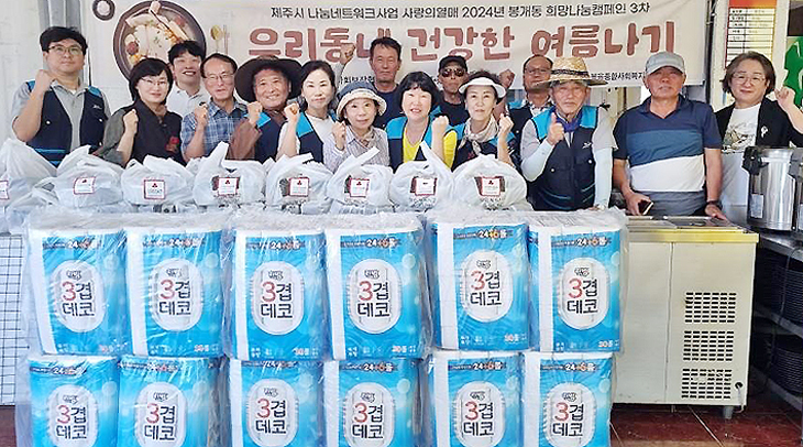 제주시 봉개동지역사회보장협의체(공동위원장 김중환, 봉개동장 김문규)는 지난 12일 지역 내 독거 어르신 70가구를 방문해 보양식 삼계탕과 화장지를 전달하는 나눔 활동을 실시했다.