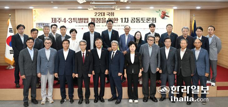 19일 제주도의회에서 열린 '22대 국회 제주4·3특별법 개정을 위한 1차 공동 토론회' 참석자들이 기념 사진을 찍고 있다. 사진=제주도의회