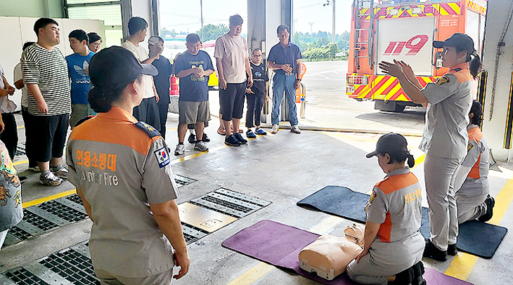 서귀포소방서 효돈의용소방대(남성대장 강갑훈, 여성대장 오금숙)는 지난 27일 장애인들의 안전과 복지 향상을 위해 해인주간활동센터 장애인 및 직원 50여 명을 대상으로 소화기 사용법 및 응급처치 교육 등 소소심 교육을 실시했다.