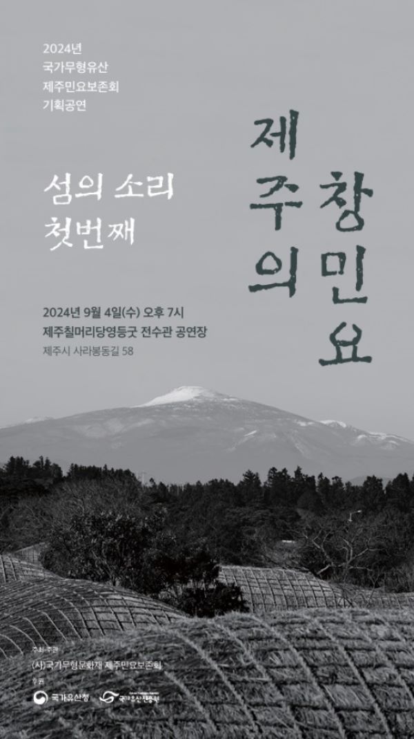 [한라일보] (사)국가무형문화재 제주민요보존회가 오는 4일 오후 7시 제주칠머리당영등굿 전수관 공연장에서 기획공연 '섬의 소리 첫 번째-제주의 창민요'를 선보인다.