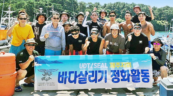 지난해 우도와 비양도 수중정화활동에 이어 실시한 이날 행사는 해군 UDT·SEAL 전우회 제주지회 하계수련대회와 함께 이뤄졌다.