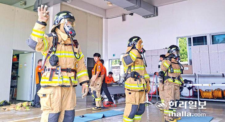 이번 평가에서 화재진압대원과 구조대원은 로프매듭, 공기호흡기 장착 및 비상 호흡법, 2인 사다리조법을, 구급대원은 개인별 전술 능력 평가로 진행됐다.