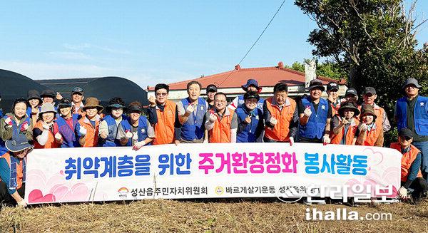 [한라일보] 서귀포시 성산읍(읍장 김경범)은 지난달 31일과 이달 2일 성산읍지역사회보장협의체(공동위원장 김경범, 오상윤), 성산읍주민자치위원회(위원장 고봉석), 바르게살기운동성산읍위원회(회장 김양선), 성산포로타리클럽(회장 강창철)과 협력해 신산리 독거노인 가구 대상 주거 환경 개선 사업을 실시했다.