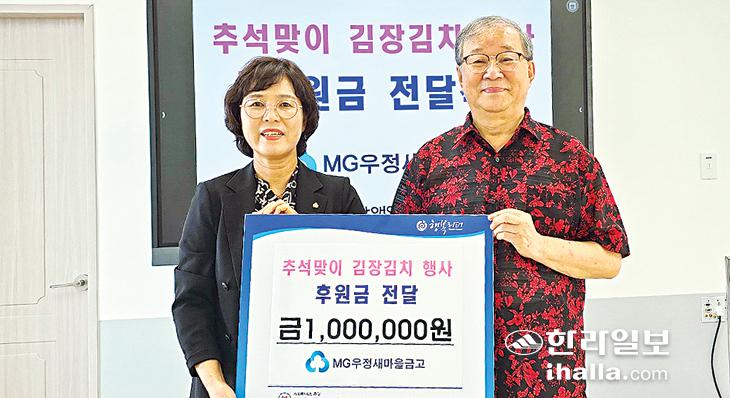 우정새마을금고(이사장 한정선)는 지난달 29일 제주특별자치도장애인종합복지관(관장 고경희)에 추석맞이 김치 지원사업 100만원을 후원했다.