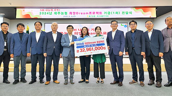 [한라일보] 제주농협 농축산인 행복나눔운동본부(공동본부장 윤재춘, 강병진)는 지난 4일 제주농협 대회의실에서 제주사회복지공동모금회(회장 강지언)를 비롯한 도내 사회복지시설 관계자 등 70여 명이 참석한 가운데 '제주농협 희망드림 프로젝트(1차) 전달식'을 개최했다.