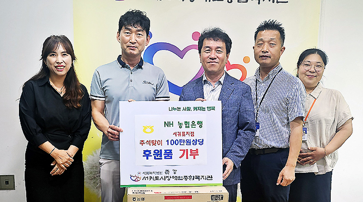 농협은행 서귀포지점(지점장 김병산)은 추석을 앞둔 11일 서귀포시장애인종합복지관(관장 윤보철)을 방문해 어려운 이웃을 위한 100만원 상당의 후원품을 전달했다.
