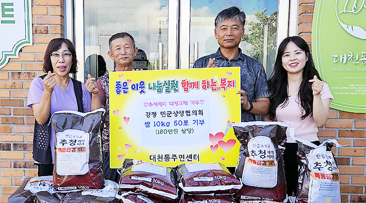 강정 민관군상생협의회는 지난 13일 추석을 맞아 소외된 이웃들을 돕는 데 써 달라며 쌀 10㎏·50포(180만원 상당)를 서귀포시 대천동주민센터(동장 윤세명) 대천고팡에 기부했다.