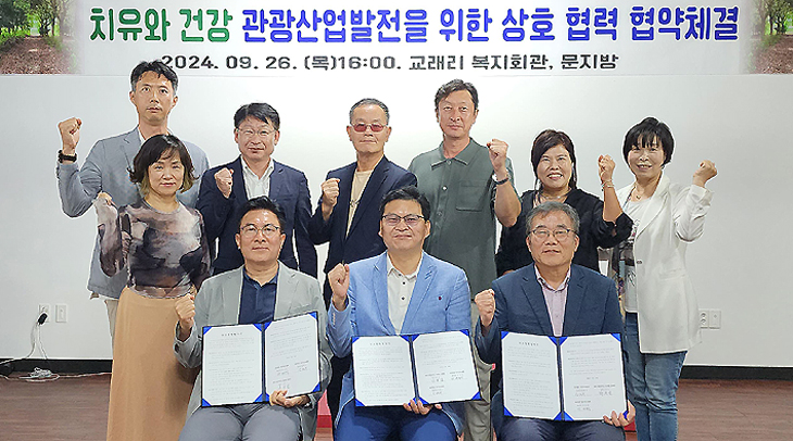 제주시 조천읍 교래리(이장 나봉길)는 지난 26일 교래리사무소에서 사단법인 한국치유협회(이사장 박장준), 사단법인 제주치유협회(회장 임택규)와 함께 교래리 마을의 치유와 건강 및 관광산업 발전을 위한 3자 간 양해각서를 체결했다.