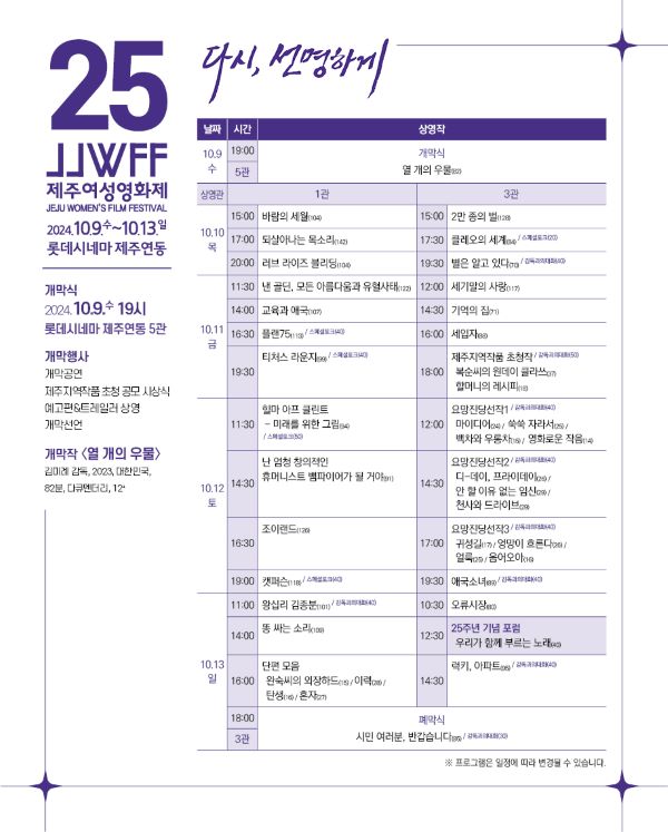 프로그램 섹션은 ▷25주년 특별전(25주년 기념 특별 프로그램 2편) ▷올해의 특별시선(올해 슬로건을 떠올리게 하는 논쟁적 이야기 8편) ▷여풍당당 그녀들(다양한 곳에서 주도적인 삶과 관계를 만들어 가는 여성들의 이야기 7편) ▷그래도 삶은 지속된다(삶에 존재하는 여러 문제들, 그럼에도 지속되는 우리의 이야기 12편) ▷요망진 당선작(단편경선에 공모한 신진 여성감독들의 영화 444편 중 본선에 진출한 11편) ▷제주지역작품 초청작(제주지역 여성서사를 발굴, 지원하기 위한 비경쟁 공모전 선정작 2편)으로 짜여졌다. '25주년 특별전' 상영작 중 '왕십리 김종분'은 역대 제주여성영화제 개·폐막작 중 관객투표를 통해 재상영작으로 선정됐다. 개막작은 '열 개의 우물', 폐막작은 '시민 여러분, 반갑습니다'다.