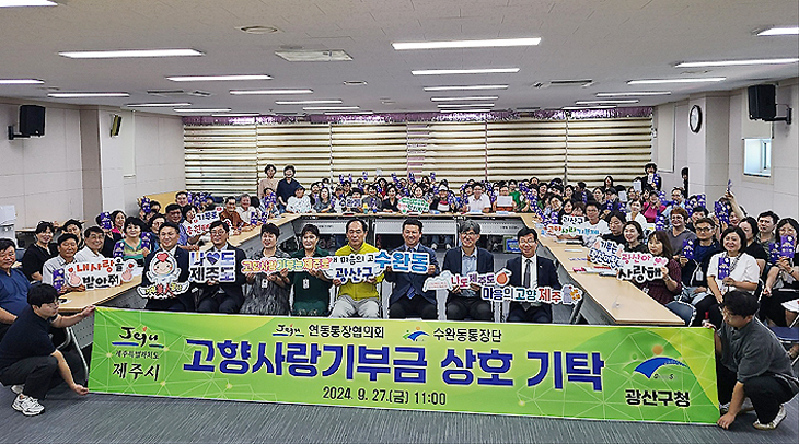 제주시 연동주민센터(동장 원훈철)와 연동통장협의회(회장 김상현)는 지난달 27일 광주광역시 광산구 수완동 행정복지센터를 찾아 고향사랑기부제 상호 기탁 협약식을 가졌다.