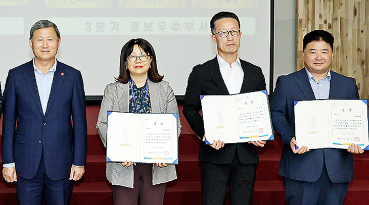 이날 시정 홍보 평가 결과 감귤농정과, 남원읍, 동홍동이 각각 최우수 부서로 표창패를 받았다.