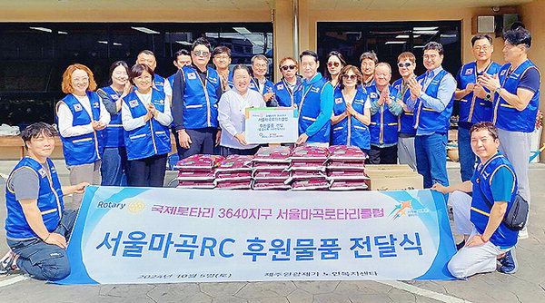 [한라일보] 국제로타리 3640지구 서울마곡로타리클럽(회장 성대 임찬희)은 지난 5일 상반기 제주도단합대회 이후 제주원광재가노인복지센터(센터장 양지혜)를 찾아 쌀과 잡곡 등 200만원 상당의 후원물품을 전달하며 경로사상을 실천했다.