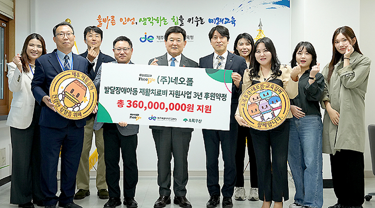 (주)네오플(대표 윤명진)은 7일 제주도교육청에서 초록우산(회장 황영기) 및 제주도교육청(교육감 김광수)과 발달장애아동 재활치료비 지원사업 업무협약을 맺었다.