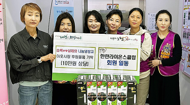 국제라이온스협회 354-G지구 한란라이온스클럽(회장 정금미)은 7일 제주시 노형주민센터에 설치돼 있는 나눔 냉장고 '솜뽁살레'에 두유 등 물품을 기탁했다.