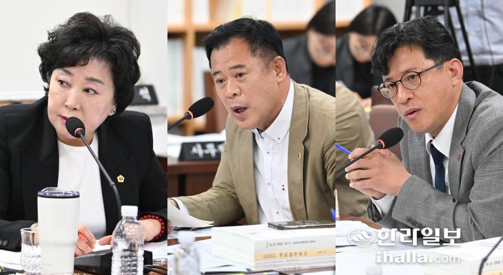 사진 왼쪽부터 제주도의회 문화관광체육위원회 박두화, 김대진, 양영수 의원. 제주도의회 제공