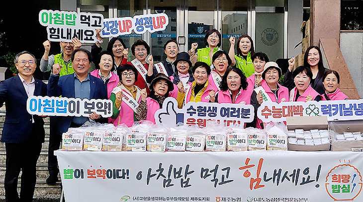 농협제주본부(본부장 윤재춘)와 (사)고향주부모임 제주도지회(회장 김진범)는 지난 14일 남녕고등학교에서 등교하는 학생과 교사들에게 떡과 쌀국수, 식혜 꾸러미를 나눠주며 아침밥 먹기 캠페인을 벌였다.