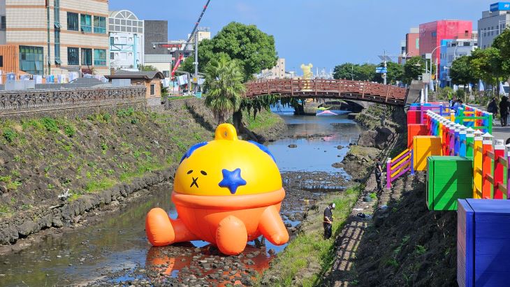 오는 18일 제주시가 주최하는 '2024 아트페스타인제주' 개막을 앞두고 현재 설치 작업이 한창이다. 산지천에 설치된 야외 입체작품. 아트페스타인제주추진위원회 제공