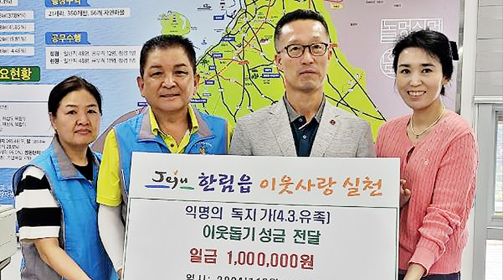 제주4·3유족으로만 알려진 익명의 독지가가 지난 15일 제주시 한림읍 지역 내 어려운 장애인을 돕고 싶다며 성금 100만원을 한림읍 장애인지원협의회(회장 문승훈)에 기부했다.