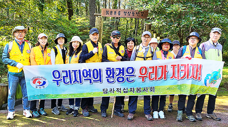 탐라적십자봉사회(회장 고경식)는 최근 서귀포시 표선면 가시리 붉은오름휴양림과 말찻오름 주변에서 봉사원 20여 명이 참가한 가운데 '우리지역 환경은 우리가 지키자!'는 슬로건 아래 둘레길 환경정화 활동을 진행했다.