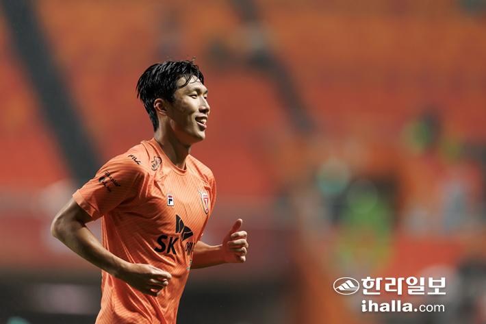 27일 전북 현대와의 K리그1 35라운드 홈경기에서 결승골은 넣은 제주 송주훈. 한국프로축구연맹 제공