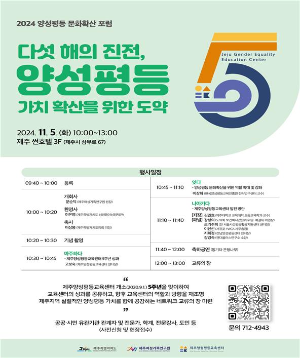 [한라일보] 제주여성가족연구원 제주양성평등교육센터(센터장 고보숙)는 오는 5일 오전 10시 제주썬호텔 3층에서 '다섯 해의 진전, 양성평등 가치확산을 위한 도약'이란 주제로 2024 양성평등 문화확산 포럼을 개최한다.