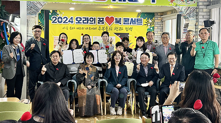 백일장 시상식에 이어 진행된 '오라의 꿈 북 콘서트'에서는 회원들의 창작품 발표와 시낭송, 동화구연, 책낭독, 제주어 시, 맛있는 이야기, 마술, 어르신 공연으로 월구마을 어르신 '언제나 청춘, 더불어 숲 어린이들의 오카리나 공연, 주부들의 명품 하모니 돌체의 퍼포먼스로 무대를 사로잡았다. 또 관객과 함께하는 '사랑의 밧데리' 라는 공감 수화로 행사 참석자 모두가 하나가 돼 10월 마지막 날을 장식하며 행복한 내일을 꿈꾸는 소중한 시간으로 꾸려졌다. <문명숙 시민기자>