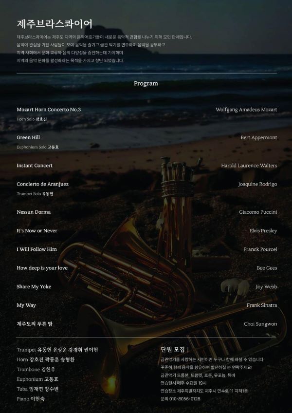 지역의 음악 문화를 활성화하고자 하는 열정으로 지난 몇 달간 연습에 매진해 온 제주브라스콰이어는 다채로운 레퍼토리를 통해 따스한 금빛 하모니로 감동의 선율을 선사할 예정이다.