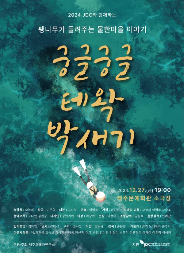 27일 오후 7시 제주 문예회관 소극장에서는 제주오페라연구소(대표 오능희)가 '2024 JDC 도민지원사업'의 일환으로 준비한 팽나무가 들려주는 물한마을 이야기 오페라 '궁글궁글 테왁박새기' 공연이 펼쳐진다. 1960년대 초반 바닷가 물한마을 해녀들의 삶과 애환을 담아낸 순수창작 오페라 작품이다.