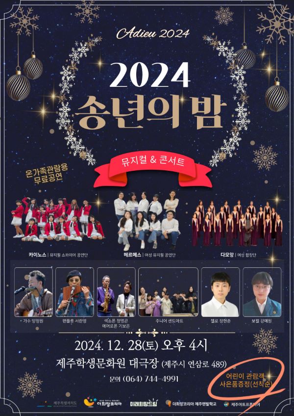 오는 28일 오후 4시 제주학생문화원 대극장에서 송년 감사 콘서트 '2024 송년의 밤'이 열린다. 한 해 동안의 감사한 마음을 나누고, 희망찬 새해를 준비하는 의미로 기획된 무대다.