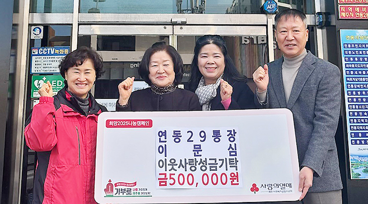 이문심 연동29통장은 지난달 30일 연동주민센터(동장 원훈철)와 연동지역사회보장협의체(위원장 신애복)에 성금 50만원을 기부했다.
